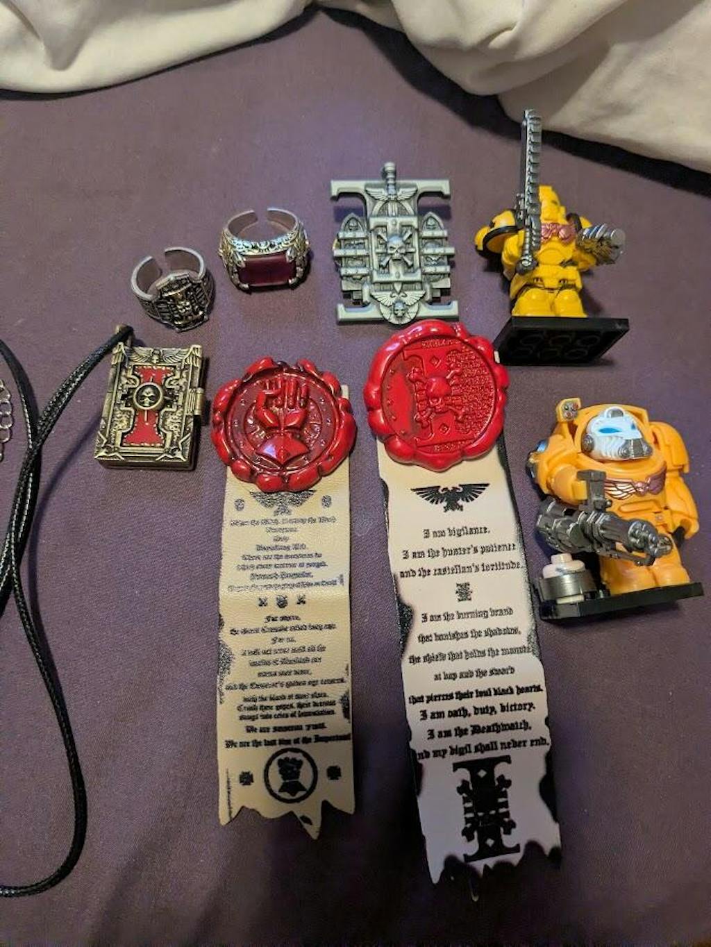 everything looks good and is at a great price, especially if you get a combo purchase like i did that got me the 2 miniatures, an extra purity seal for no extra charge. would reccomend for warhammer merch on a budget!